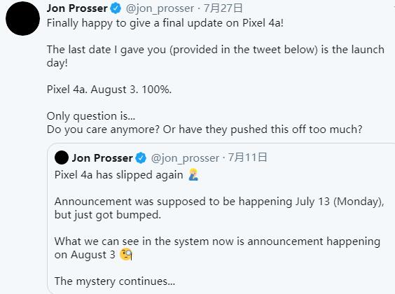 7月27日,據(jù)外媒報(bào)道,知名數(shù)碼博主@jon_prosser在推特爆料,Pixel 4a將于8月3日發(fā)布,并稱這一消息100%無(wú)誤。