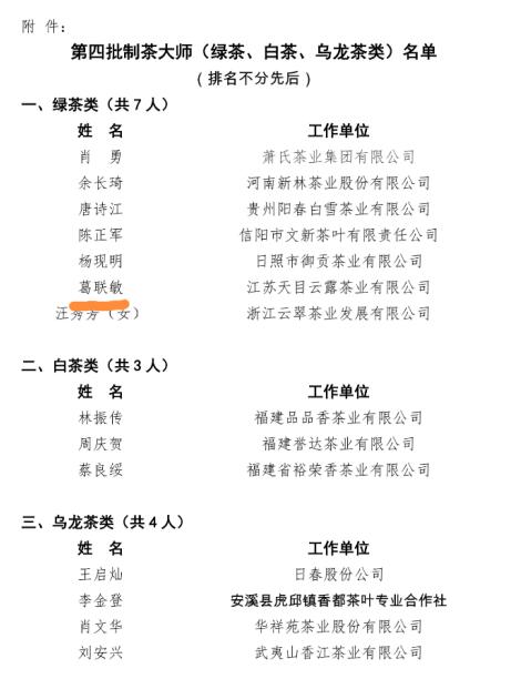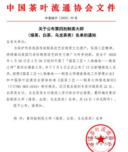 2020年1月20日至4月30日組織開展了第四次調(diào)查工作,并于7月3日正式公布了17位新增候選人名單。按照《國(guó)茶工匠·人物推選一一制茶大師調(diào)查推選工作管理辦法》和中國(guó)茶葉流通協(xié)會(huì)團(tuán)體標(biāo)準(zhǔn)《國(guó)茶工匠--制茶大師推選細(xì)則》(T/CTMA 003-2018)相關(guān)規(guī)定,對(duì)候選人進(jìn)行綜合評(píng)議推薦,最終確定第四批制茶大師(綠茶、白茶、烏龍茶類)名單共14位。江蘇天目雲(yún)露茶業(yè)有限公司董事長(zhǎng)葛聯(lián)敏作為本批次的綠茶類制茶大師名列其中,實(shí)屬不易。