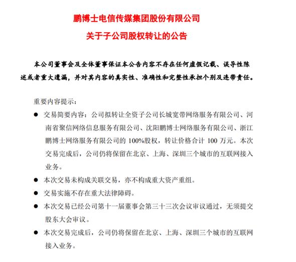 近日,鵬博士電信傳媒集團(tuán)股份有限公司發(fā)布關(guān)于子公司股權(quán)轉(zhuǎn)讓的公告稱,公司擬轉(zhuǎn)讓全資子公司長(zhǎng)城寬帶網(wǎng)絡(luò)服務(wù)有限公司、河南省聚信網(wǎng)絡(luò)信息服務(wù)有限公司、沈陽鵬博士網(wǎng)絡(luò)服務(wù)有限公司、浙江鵬博士網(wǎng)絡(luò)服務(wù)有限公司的 100%股權(quán),轉(zhuǎn)讓價(jià)格合計(jì)100 萬元。