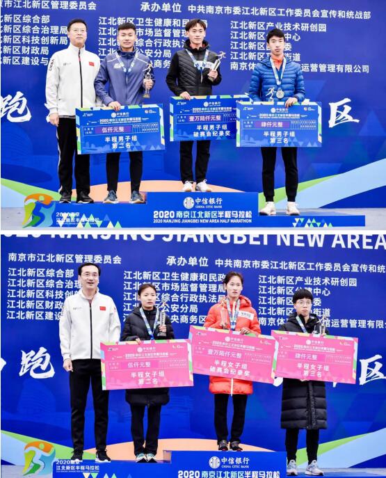 伴隨著青春活力的快閃舞蹈和激昂的國歌合唱,4500名跑者用腳步暢跑江北,以行動樂享新區(qū)。經(jīng)過激烈的角逐,李恩基獲得半程男子組冠軍,成績?yōu)?:07:50 。半程女子組冠軍由王佳莉以1:16:40的成績摘得。值得一提的是,此次中信銀行·2020南京江北新區(qū)半程馬拉松男女組冠軍成績均打破賽會紀錄。在首屆賽事的基礎上,本屆賽事在獎項設置上也更加豐富,不僅新增了破賽會紀錄獎,還新增了跑團賽中賽獎,給更多非專業(yè)跑者一爭殊榮的機會。
