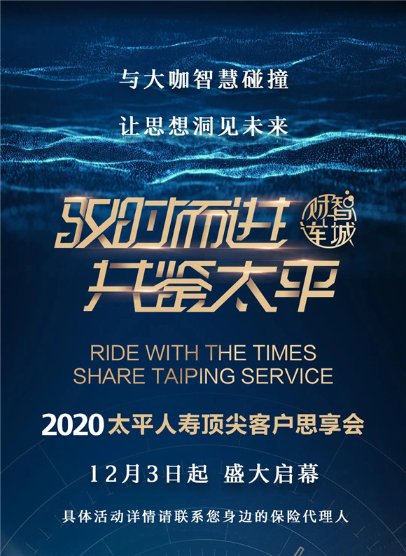 面對即將到來的2021年,中國太平聯(lián)合中國頂級經(jīng)濟金融智庫-長江商學院,與太平的伙伴、客戶朋友一道,共同探索下一個十年,與客戶并肩描繪未來的美好藍圖,馭時而進,共鑒太平。作為金融保險央企——中國太平保險集團有限責任公司旗下成員公司,太平人壽踐行央企擔當,將于12月3日至12月4日舉辦“馭時而進 共鑒太平”財智聯(lián)城高端客戶思享會。