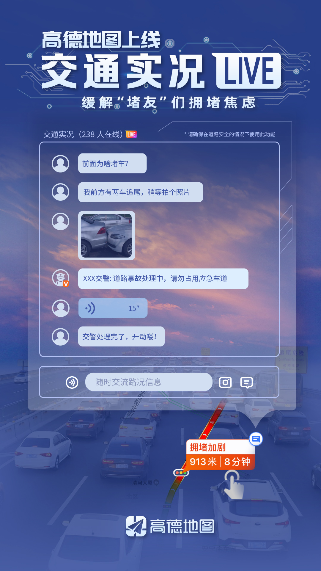 根據(jù)前期調(diào)研分析,遇到堵車(chē)時(shí),46%的司機(jī)最關(guān)心還會(huì)堵多久,36%的司機(jī)最想知道擁堵原因。隨著擁堵時(shí)間變長(zhǎng),人們的關(guān)注點(diǎn)會(huì)轉(zhuǎn)移到擁堵處理進(jìn)度上,比如交警是否到場(chǎng),事故是否解決等。但由于交通擁堵多為臨時(shí)性偶發(fā),此前沒(méi)有一個(gè)權(quán)威的信息平臺(tái)可以解答這些疑問(wèn)。