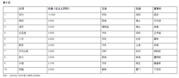 此外,美的以5800億元價值位列第二,海天以5000億元價值位列第三,比亞迪以4900億元價值排名第四,小米以4600億元價值排名第五。蔚來、農(nóng)夫山泉、格力、長城、安踏依次進(jìn)入前十。