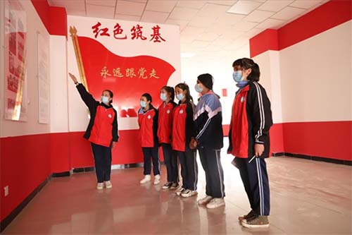新疆疏附三中穗疏共建“紅色筑基”愛國主義教育基地里,由共青團(tuán)員和少先隊(duì)員組成的“紅孩兒”宣講員,在認(rèn)真地向?qū)W校老師和同學(xué)做解說