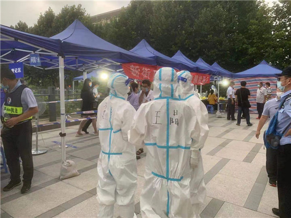 在孝陵衛(wèi)啟迪小學(xué)核酸監(jiān)測點和長江路社區(qū),后援和銀保黨支部的志愿者們克服高溫,與醫(yī)護人員一道開展防疫檢測工作 ,沒有空調(diào)、汗水濕透了防護服,但他們依舊堅持到了凌晨1點才結(jié)束戰(zhàn)斗。