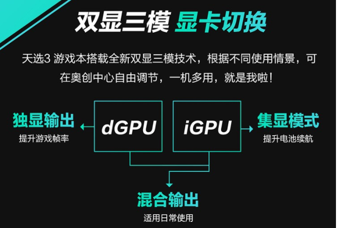 首先給不太清楚的小伙伴們科普一下,“雙顯三模”顯卡切換的作用是允許用戶根據(jù)筆記本使用的場景進(jìn)行顯卡模式切換,雙顯指有獨(dú)顯、集顯兩塊顯卡,而三模是指針對這兩塊顯卡,系統(tǒng)可以提供三種不同的模式調(diào)用,分別有獨(dú)顯輸出、混合輸出以及集顯模式三種模式。