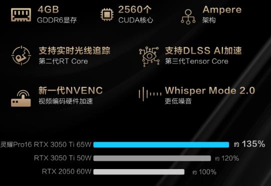 顯卡方面,靈耀Pro16 2022搭載Nvidia GeForce RTX 3050Ti光追獨(dú)顯。全新Ampere架構(gòu),擁有2560個(gè)CUDA核心以及4GB GDDR6顯存。在DLSS AI加速和Dynamic Boost2.0顯卡智能動(dòng)態(tài)增強(qiáng)技術(shù)的參與下,功耗可提升至65W,較RTX 2050提升74%的性能,讓這塊RTX 3050Ti成為一塊真正的“性能猛獸”,能夠輕松處理各種創(chuàng)作素材和動(dòng)畫渲染。