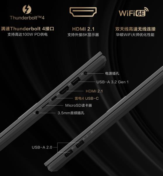 靈耀Pro16 2022配備有雷電4 Type-C等多種常用接口,拓展性全面,全接口的設(shè)計(jì)保證了創(chuàng)作者多端設(shè)備協(xié)作的需求。其中功能最為強(qiáng)大的雷電4接口具有高達(dá)40Gbps的傳輸速度,能夠外接高性能顯卡塢、高速SSD、8K顯示器等,滿足各類擴(kuò)展需求。