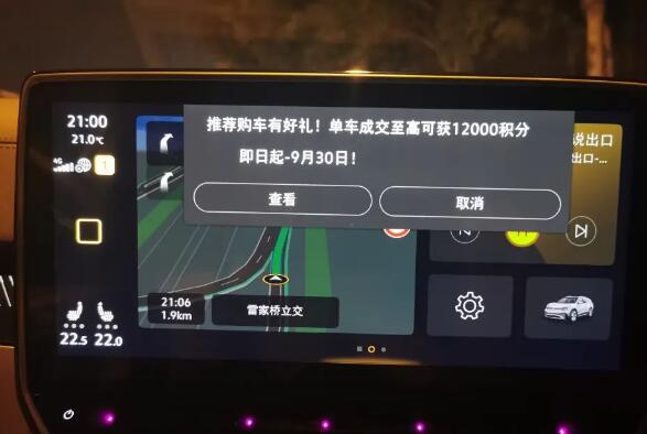 9月23日,重慶的劉女士駕駛剛買(mǎi)不久的一汽大眾ID.6Crozz純電車(chē),在使用車(chē)載導(dǎo)航進(jìn)行導(dǎo)航時(shí),顯示導(dǎo)航信息的中控屏幕突然出現(xiàn)彈窗廣告,遮擋了行駛中的導(dǎo)航信息。9月24日,王女士告訴上游新聞?dòng)浾撸?ldquo;第一次在行駛的汽車(chē)的中控屏上看到彈出的廣告,活久見(jiàn),不喜歡有這樣的彈窗。”上游新聞?dòng)浾邚膭⑴空故镜膱D片看到,中控觸摸屏顯示,車(chē)載4G網(wǎng)絡(luò)信號(hào)滿格,車(chē)輛正途徑一座立交橋,彈窗廣告面積幾乎占了觸摸屏的一半,駕駛員正在使用的導(dǎo)航行駛信息幾乎完全被遮擋。彈窗廣告上寫(xiě)著“推薦購(gòu)車(chē)有好禮!單車(chē)成交至高可獲12000積分 即日起-9月30日!”從內(nèi)容上看,劉女士告訴記者:“這個(gè)彈窗廣告應(yīng)該是廠家推送的,因?yàn)榉e分是大眾的,而不是4S店的。”