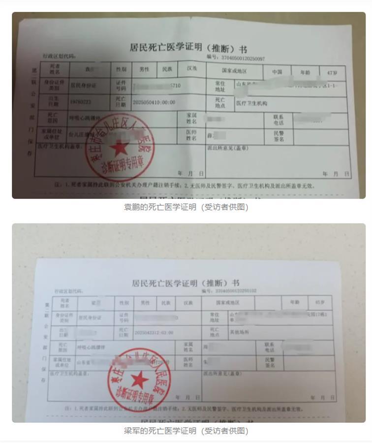 5月11日,棗莊的周麗(化名)安置好7歲的女兒,又匆忙出門去為丈夫的后事奔走。一周前的5月4日,丈夫袁鵬(化名)騎車前往餓了么長安路店上班時(shí),在小區(qū)里倒下后再也沒能起來。而在10多天前,她的妹夫梁軍(化名),同樣在去這家門店上班的路上倒下了。兩人死因都是“呼吸心跳驟?!薄?據(jù)5月11日封面新聞報(bào)道)
